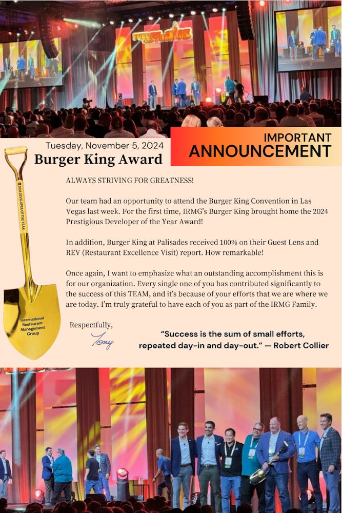 2024: Awarded Burger King Developer of the Year at the Annual Convention