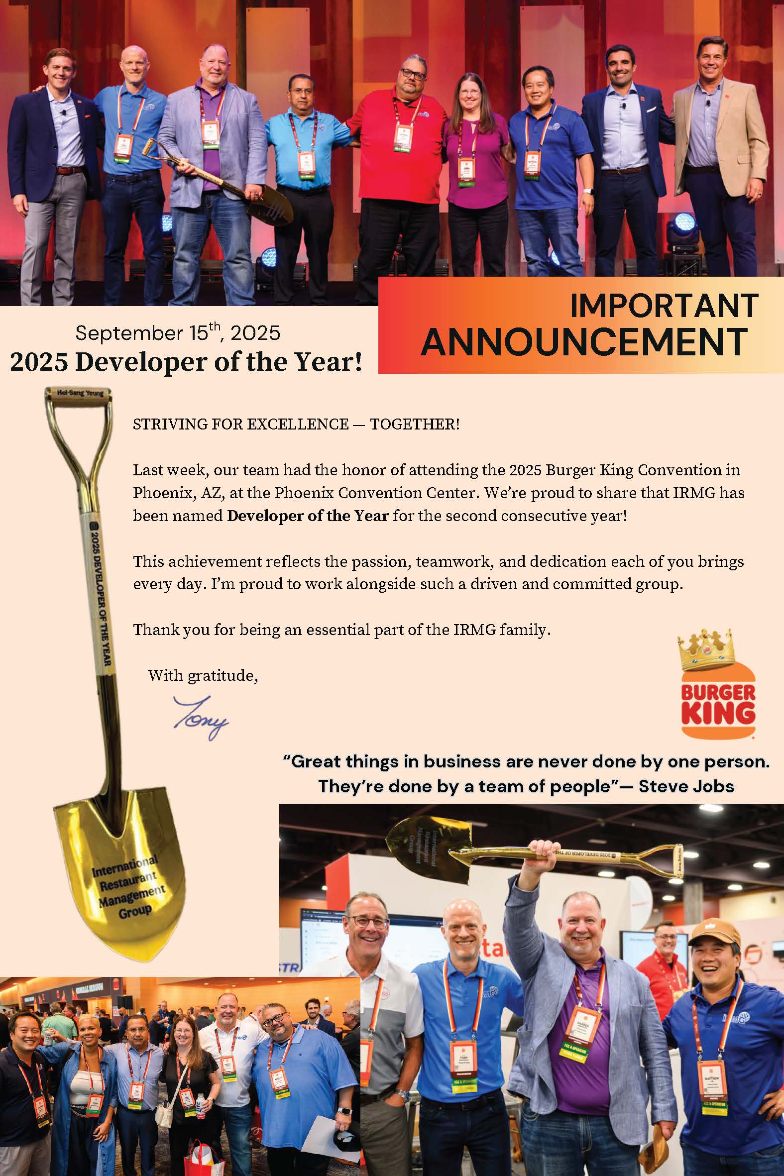 2025: Awarded Burger King Developer of the Year at the Annual Convention