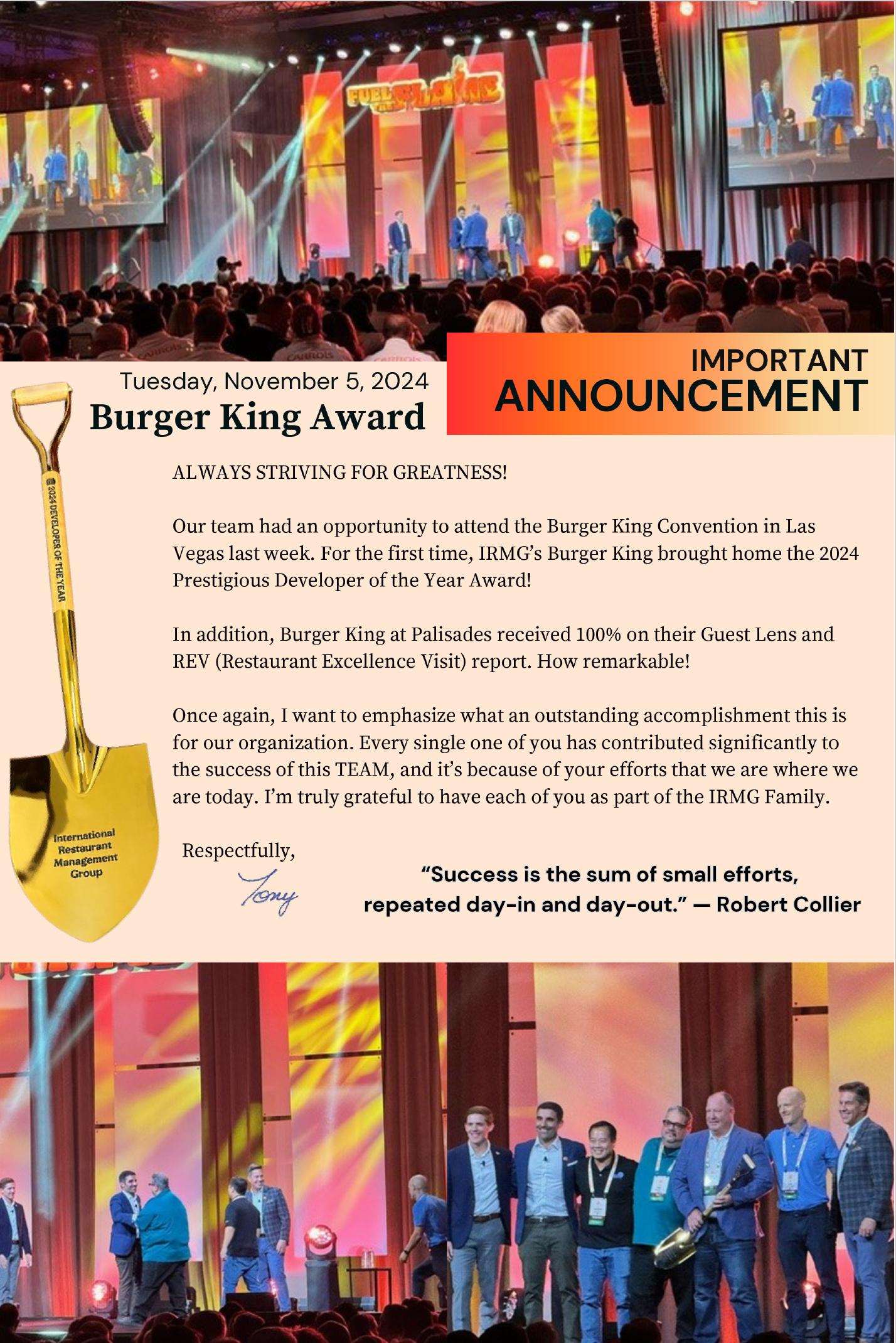 2024: Awarded Burger King Developer of the Year at the Annual Convention